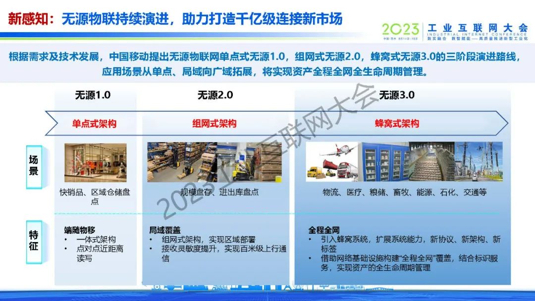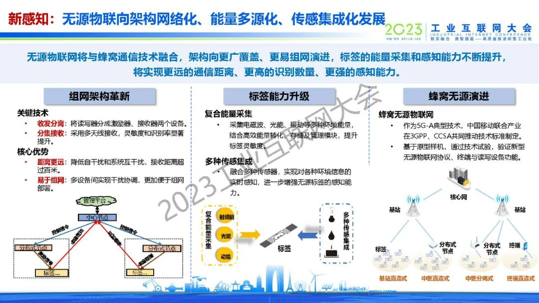 “無源物聯網將與蜂窩通信技術融合,架構向更廣覆蓋、更易組網演進,標簽的能量采集和感知能力不斷提升,將實現更遠的通信距離、更高的識別數量、更強的感知能力。“