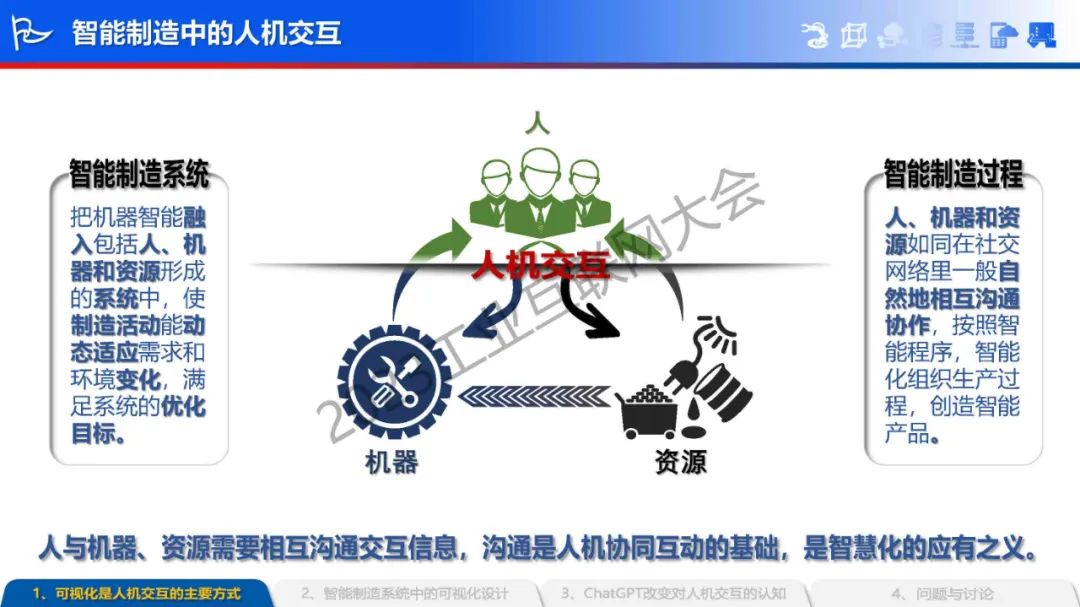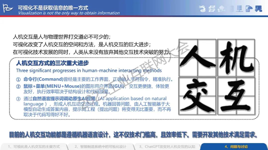 他表示,目前的人機交互功能都是遵循機器語言設計,這不僅技術門檻高,且效率低下。需要開發其他技術滿足需求。與人類自如交互的多模態大模型已經達到了謹慎可用程度,意味著人機交互又新增了一個新賽道道、新手段、新模式。通用人工智能進入智能制造過程,包括即時知識支撐、操業導航、基礎材料匯聚、多源信息整合、決策支持建議等,甚至及時發出控制動作指令。