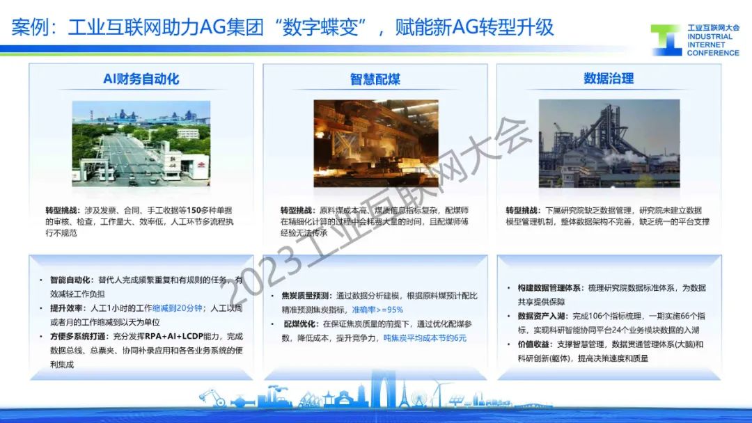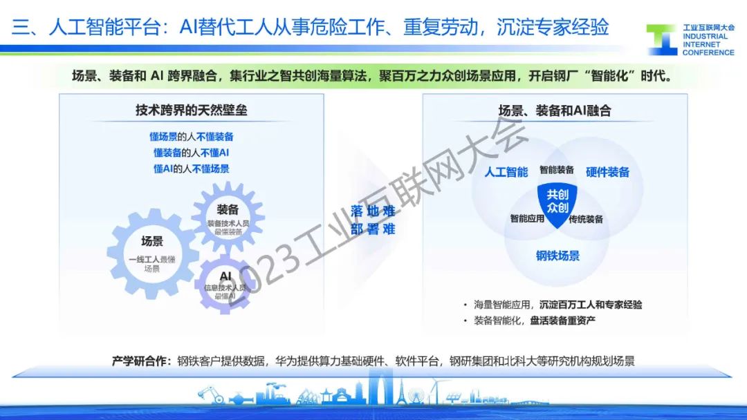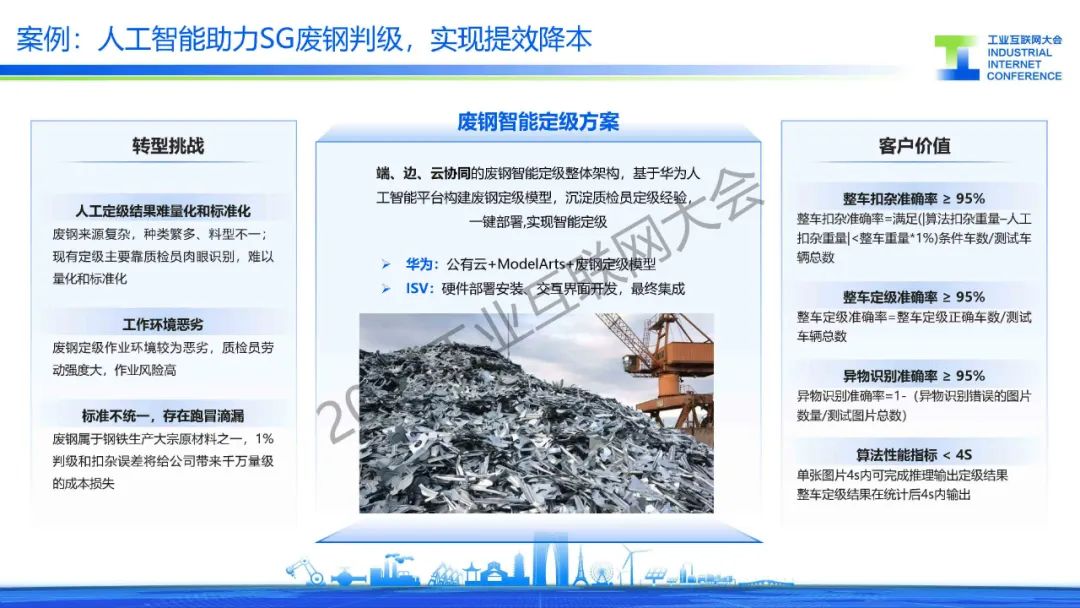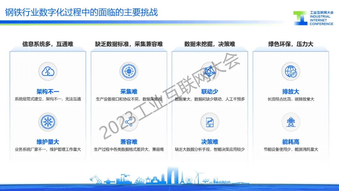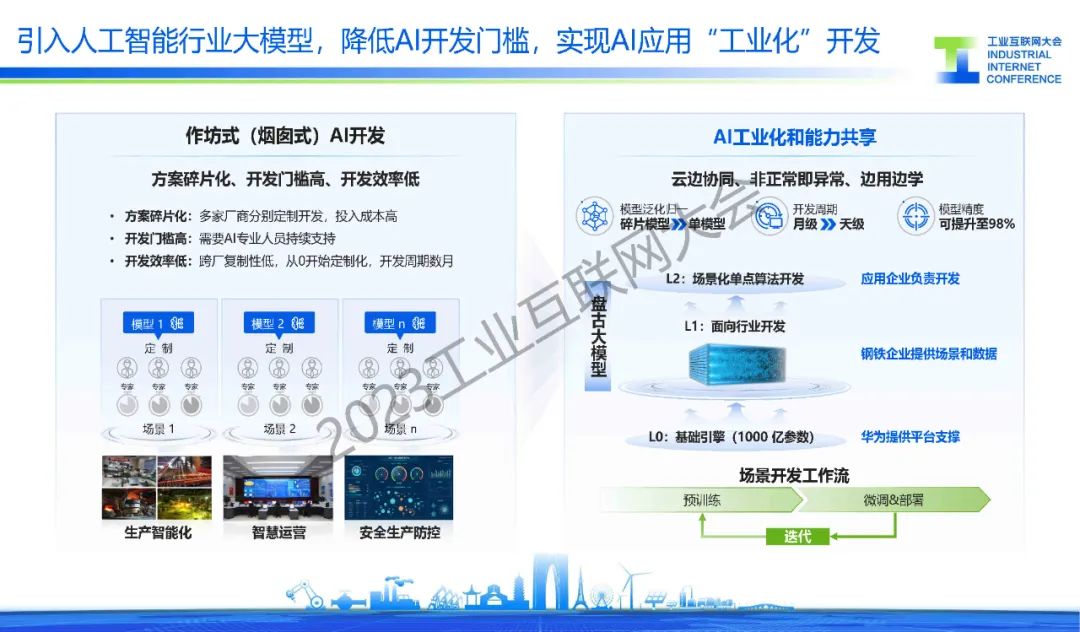 胡罡介紹,鋼鐵行業(yè)處在數(shù)字化轉(zhuǎn)型的爆發(fā)期,智能化應(yīng)用不斷涌現(xiàn),在這過(guò)程中還面臨著信息系統(tǒng)、數(shù)據(jù)標(biāo)準(zhǔn)和環(huán)保等主要挑戰(zhàn)。目前,通過(guò)建設(shè)基于工業(yè)互聯(lián)網(wǎng)架構(gòu)的智慧鋼廠,來(lái)實(shí)現(xiàn)”提質(zhì)、降本、增效“的目標(biāo),同時(shí)引入人工智能行業(yè)大模型,降低AI開(kāi)發(fā)門(mén)檻,實(shí)現(xiàn)AI應(yīng)用“工業(yè)化”開(kāi)發(fā),開(kāi)啟鋼鐵行業(yè)智能化。