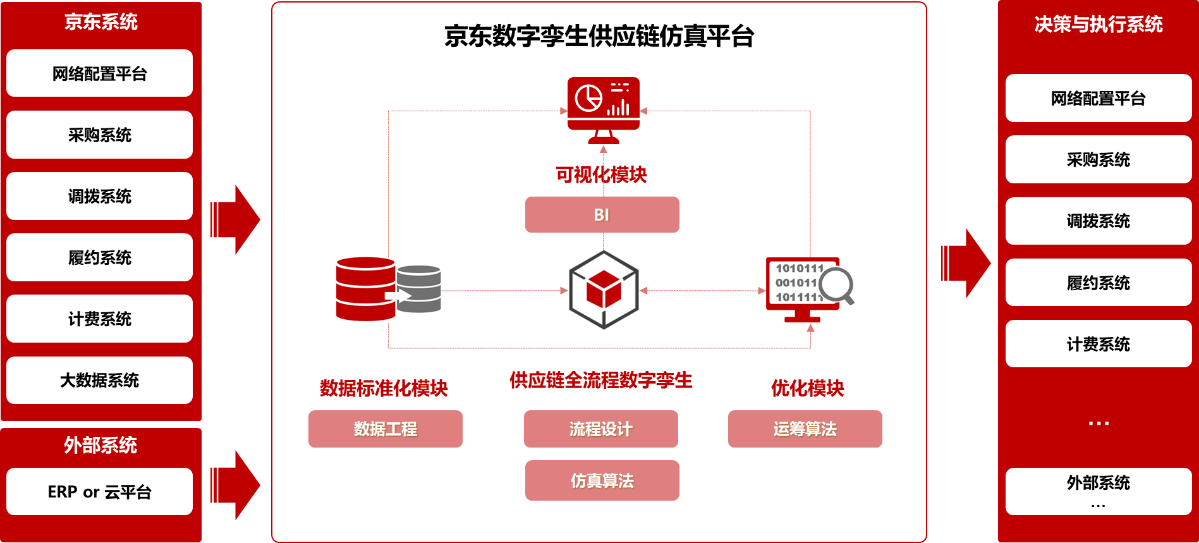 京東數(shù)字孿生供應(yīng)鏈仿真平臺允許業(yè)務(wù)對現(xiàn)狀的生產(chǎn)系統(tǒng)及業(yè)務(wù)流程進行數(shù)字建模,同時也支持業(yè)務(wù)對未來可能的供應(yīng)鏈模式進行流程設(shè)計,評估新流程的可行性及優(yōu)化結(jié)果。基于對不同策略仿真結(jié)果的分析,最終將優(yōu)化后的策略落實到執(zhí)行系統(tǒng)進行實施。京東供應(yīng)鏈仿真平臺搭建了一套標準化的供應(yīng)鏈框架,為了能夠靈活適配零售不同業(yè)務(wù)模式及不同行業(yè)特性,以模塊化的形式進行了產(chǎn)品架構(gòu)設(shè)計,各模塊彼此解耦,獨立迭代,可以支持豐富的應(yīng)用場景。