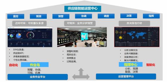 供應鏈智能運營中心不是一個供應鏈業務操作平臺,它是一個供應鏈端到端指揮和 管理平臺,通過統一指揮,實現組織間高效協同,快速響應需求,提升運營效率 ;它可以分三 層架構,第一層是基礎層,實現供應鏈業務線上可視、風險預警 ;第二層是數據驅動預測 性分析,通過基于業務場景構建算法模型,對發現問題進行根因分析及未來趨勢判斷 ;第 三層是自動執行層,它基于預測分析、場景模擬分析,通過機器學習自改善,給出問題或風 險改善建議,并自動執行形成閉環。