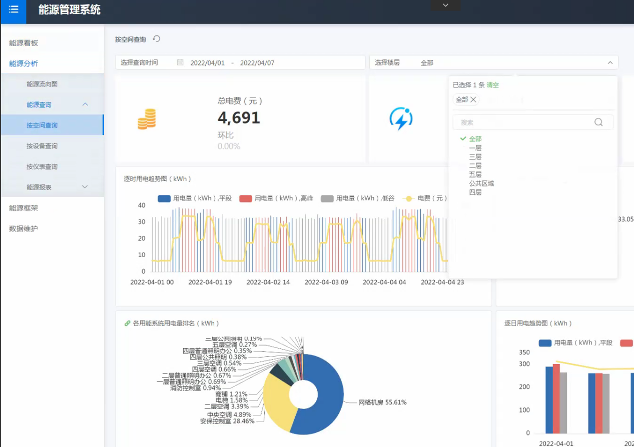 運(yùn)營分析能源管理。園區(qū)在能源管理方面具有很大的需求,能源管理能力的不足,會(huì)導(dǎo)致大量能源的浪費(fèi),園區(qū)應(yīng)對(duì)公共區(qū)域內(nèi)的用能進(jìn)行監(jiān)測,包括用水管理、用電管理、用氣管理。因此,本項(xiàng)目中通過建設(shè)全方位的能源管理系統(tǒng)對(duì)園區(qū)的能耗進(jìn)行實(shí)時(shí)采集以及能耗分析,基于人工智能在能耗分析方面的應(yīng)用,橫向?qū)Ρ韧愋蛨@區(qū)用能情況、縱向?qū)Ρ让咳铡⒃碌挠媚芮闆r,加強(qiáng)園區(qū)能耗精細(xì)化管理,發(fā)現(xiàn)園區(qū)潛在能耗大戶。