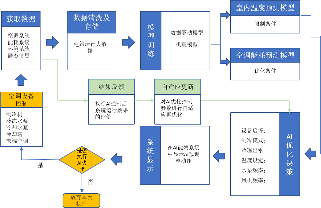 AI優(yōu)化算法通過能源中心獲取空調(diào)系統(tǒng)運(yùn)行數(shù)據(jù)、能耗數(shù)據(jù)以及建筑環(huán)境數(shù)據(jù),通過對(duì)數(shù)據(jù)清洗、整理及存儲(chǔ),以數(shù)據(jù)驅(qū)動(dòng)和系統(tǒng)機(jī)理搭建AI優(yōu)化算法模型,包括溫度預(yù)測模型和能耗預(yù)測模型,并對(duì)空調(diào)系統(tǒng)關(guān)鍵運(yùn)行參數(shù)進(jìn)行最優(yōu)決策,包括主機(jī)臺(tái)數(shù)、出水溫度、水泵頻率、新風(fēng)機(jī)組的風(fēng)機(jī)頻率、風(fēng)閥開度、水閥開度等,算法將控制指令下發(fā)給平臺(tái),實(shí)現(xiàn)設(shè)備參數(shù)的自動(dòng)調(diào)節(jié)。