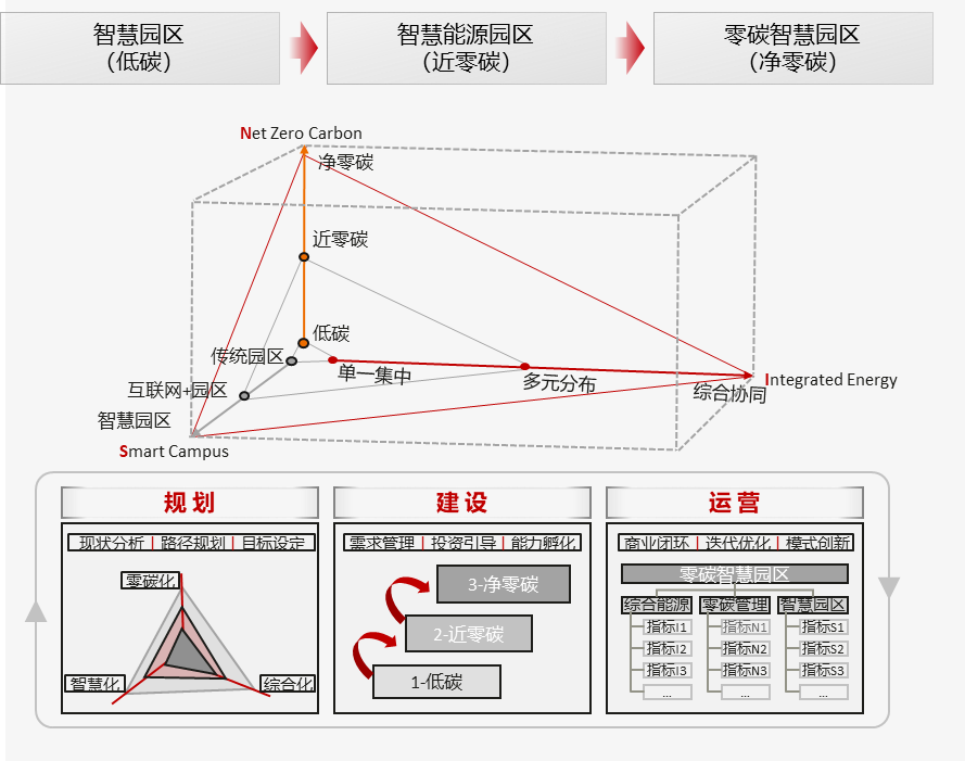 “三個效益”實現(xiàn)經(jīng)濟、社會、生態(tài)全面協(xié)調(diào)發(fā)展。一是環(huán)境效益。打造多能互補微網(wǎng),有效提升園區(qū)清潔能源占比,采用就地生產(chǎn)、就地消納的供應形式,集中式和分布式相協(xié)調(diào)互補,在微能源網(wǎng)內(nèi)實現(xiàn)自發(fā)自用,能量平衡,實現(xiàn)能源綜合轉換效率的提升。二是管理效益。通過物聯(lián)網(wǎng)、云計算、大數(shù)據(jù)和人工智能等新一代信息技術,建立集“視管控營”一體的綜合運營與管理平臺,實現(xiàn)物與物、人與物、人與碳、物與碳、碳與能的聯(lián)接,實現(xiàn)對設備、能源、人員和環(huán)境的精細化管理和服務,使得園區(qū)綜合管理的運行效率和準確率有了極大地提升。三是社會效益。園區(qū)開展綜合能源項目建設,加快業(yè)務向用能服務轉型,加快經(jīng)營向質(zhì)量效益轉型,在綜合能源網(wǎng)絡、能源管理平臺、能源服務模式多方面形成示范應用,助力實現(xiàn)國家“碳中和、碳達峰”戰(zhàn)略目標。