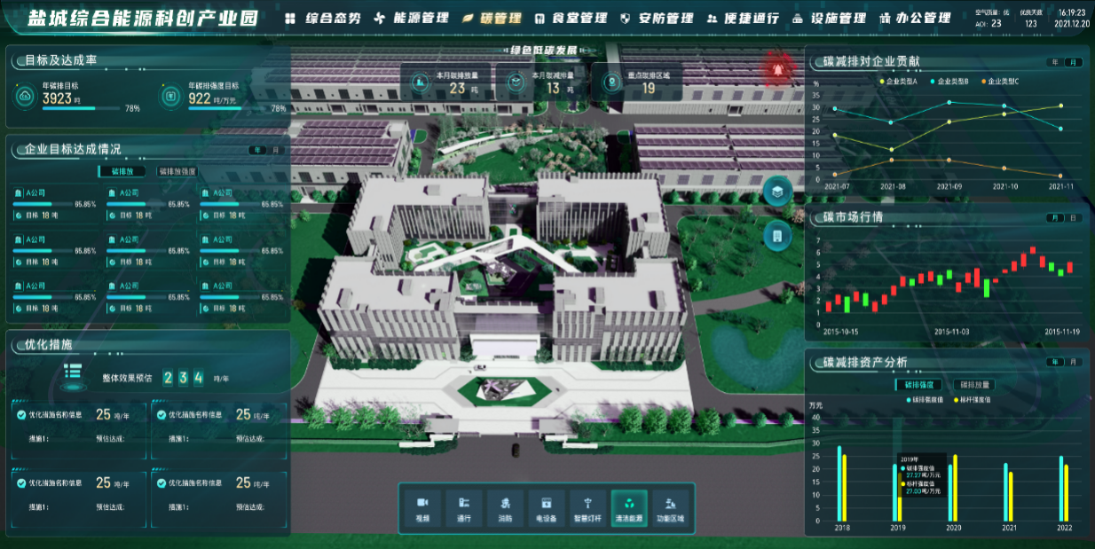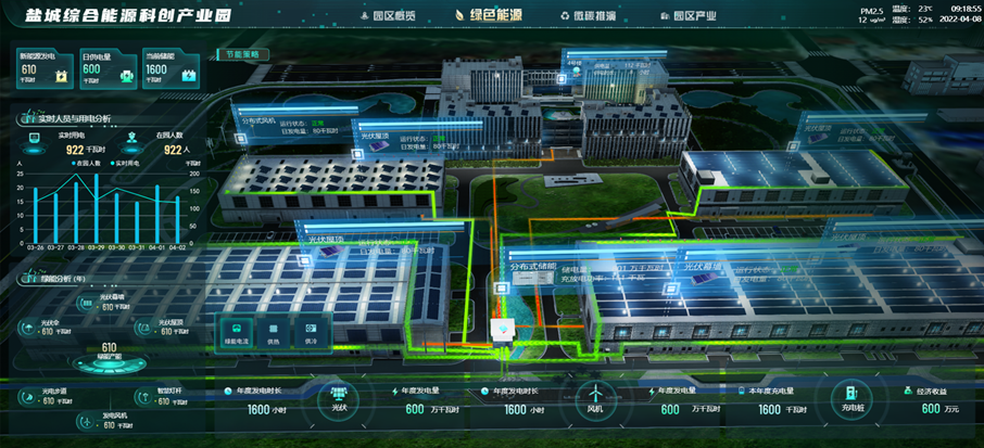 基于園區(qū)全電能源消費優(yōu)勢,依托鹽城市較高的新能源電力比例基礎上,依靠園區(qū)部署多種風光發(fā)電設備以及地源熱泵系統(tǒng),目標做到清潔能源生產(chǎn)占比85%。部署多種綠能設備的同時,引入儲能設備與綜合能源管理系統(tǒng),進一步提升綠色能源在節(jié)能降碳和多種能源互補效果。集成了能源EMS系統(tǒng)、地源熱泵及氣象站數(shù)據(jù),利用GIS數(shù)字孿生技術,對園區(qū)綠能電力、供冷、供熱進行空間實時流向展示及數(shù)據(jù)多維度分析。通過IoT、數(shù)據(jù)算法等技術對用能進行智能調(diào)控,達到能源最優(yōu)化、辦公環(huán)境最佳化。通過EMS系統(tǒng)一鍵控制綠能策略執(zhí)行,通過數(shù)字平臺能夠看到綠能執(zhí)行的流向情況。
