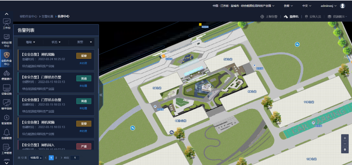 面向園區(qū)日常運營管理,通過園區(qū)數(shù)字平臺,將原本孤立的周界、門禁、消防、車輛、樓宇、群控、設施、資產(chǎn)、環(huán)境、辦公等業(yè)務子系統(tǒng)統(tǒng)一接入、匯聚、建模,將安防系統(tǒng)、物聯(lián)網(wǎng)系統(tǒng)相關系統(tǒng)等信息進行整合,形成數(shù)字孿生園區(qū),立體呈現(xiàn)園區(qū)的整體情況,包括人員/車輛態(tài)勢、園區(qū)安防態(tài)勢、能源消耗情況、設施和資產(chǎn)運營態(tài)勢、環(huán)境和空間使用情況等,并通過聯(lián)動視頻監(jiān)控系統(tǒng)、物聯(lián)網(wǎng)系統(tǒng)遠程查看和控制。