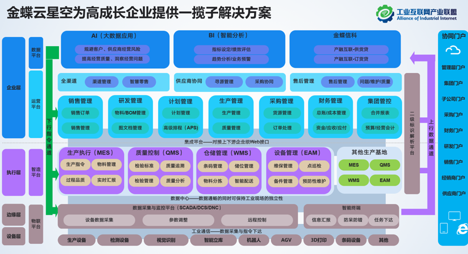 金蝶云·星空高成長工業(yè)互聯(lián)網(wǎng)解決方案依托國家級“雙跨”平臺之一的金蝶星域工業(yè)互聯(lián)網(wǎng)平臺,聚焦高成長型企業(yè),是目前國內(nèi)唯一一款PLM+ERP+MES一體化解決方案。金蝶云·星空堅(jiān)持“企業(yè)對發(fā)展期望就是我們的奮斗目標(biāo)”的價(jià)值觀,和高成長企業(yè)一起共創(chuàng)了在數(shù)字經(jīng)濟(jì)下新的工業(yè)互聯(lián)網(wǎng)解決方案,幫助中小企業(yè)進(jìn)行“數(shù)字化轉(zhuǎn)型”能力建設(shè):在傳統(tǒng)的企業(yè)經(jīng)營管理的基礎(chǔ)上,拓展了解決新產(chǎn)品研發(fā)的PLM,解決柔性制造的MES系統(tǒng),實(shí)現(xiàn)供應(yīng)鏈的全渠道、供應(yīng)商協(xié)同等解決方案,幫助中小企業(yè)用數(shù)字化工具實(shí)現(xiàn)內(nèi)部的全數(shù)字化覆蓋。