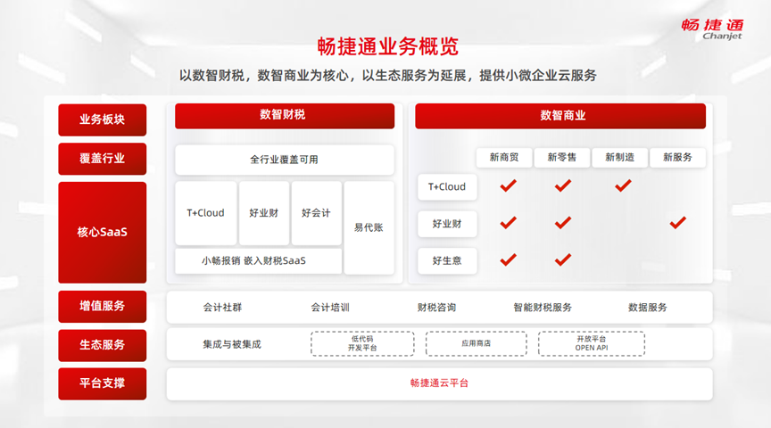 暢捷通是用友旗下成員企業(yè),專注為小微企業(yè)提供財(cái)稅及業(yè)務(wù)云服務(wù),公司成立于2010年3月,并于2014年6月26日在香港聯(lián)交所掛牌上市。近年來,暢捷通推出了一系列服務(wù)于小微企業(yè)的SaaS產(chǎn)品,包括好會(huì)計(jì)(智能云財(cái)稅)、好生意(營銷型云進(jìn)銷存)、T+Cloud(全場景數(shù)智商業(yè)云應(yīng)用)、好業(yè)財(cái)(創(chuàng)新企業(yè)數(shù)智經(jīng)營平臺(tái))、易代賬(數(shù)智財(cái)稅平臺(tái))等,暢捷通云平臺(tái)累計(jì)注冊(cè)用戶數(shù)超過800萬。