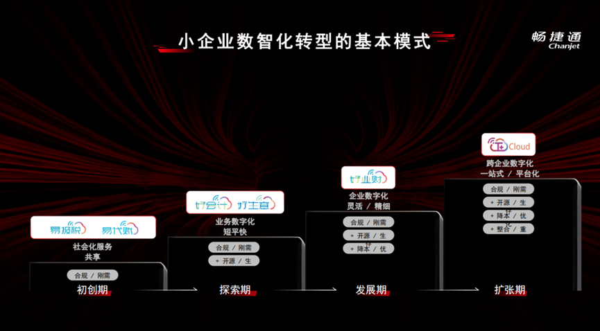 暢捷通為初創(chuàng)期的小微企業(yè)提供易報(bào)稅等服務(wù),滿足其省心省力的剛需;在探索期,以好生意多個(gè)版本的數(shù)字化工具為小微企業(yè)賦能,助力企業(yè)在線拓客戶、在線做生意;在發(fā)展期,通過好業(yè)財(cái)數(shù)字化平臺(tái)幫助企業(yè)一站式管客戶、管合同、管項(xiàng)目、管銷購存,同時(shí)實(shí)現(xiàn)信息流、貨物流、發(fā)票流和資金流的四流合一,業(yè)財(cái)一致,助力企業(yè)合規(guī)發(fā)展;對(duì)于擴(kuò)張期的小企業(yè),暢捷通拳頭產(chǎn)品T+Cloud幫助企業(yè)數(shù)字化轉(zhuǎn)型賦能更顯威力,從產(chǎn)品設(shè)計(jì)到生產(chǎn)加工、從物料采購到倉儲(chǔ)物流、從客戶管理到供應(yīng)商協(xié)同、從直營銷售到分銷零售管理、從物事人管理到票財(cái)稅銀檔一體化管控,幫助快速擴(kuò)張的小企業(yè)實(shí)現(xiàn)全要素、全鏈路、全渠道、全流程數(shù)字化經(jīng)營提效。