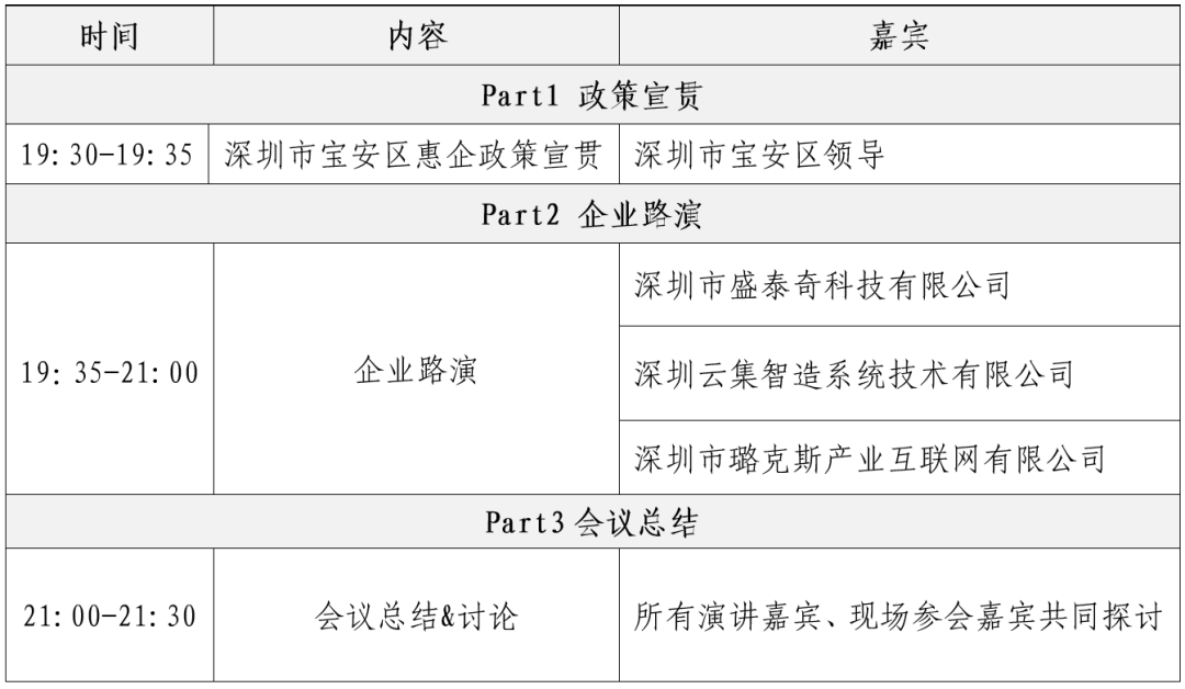 為幫助企業拓寬投融資渠道,搭建產融對接平臺,助力企業紓困發展,工業互聯網產業聯盟(簡稱“聯盟/AII”)“我為企業辦實事”投融資沙龍將在第二十四次工作組全會期間繼續開展。本次沙龍邀請了深圳市寶安區領導分享惠企政策,三家有融資需求的企業將現場路演,高成資本、凱聯資本及AII政策法規與投融資組、需求組的專家將出席活動,為企業提供融資對接和指導,也歡迎各成員單位積極參與。