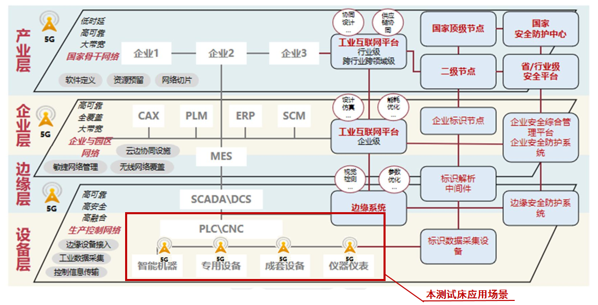 本測試床屬于AII總體架構(gòu)中網(wǎng)絡(luò)互聯(lián)部分,其應(yīng)用場景在AII《工業(yè)互聯(lián)網(wǎng)體系架構(gòu)(版本2.0)》中的位置如下圖所示。在關(guān)鍵技術(shù)驗證上,本測試床重點測試驗證5G端到端確定性技術(shù)在高精度時間同步精度、可靠性、時延和抖動等維度可提供的通信服務(wù)能力;在應(yīng)用場景驗證上,本測試床重點測試驗證5G確定性通信技術(shù)應(yīng)用于PLC南向控制現(xiàn)場設(shè)備的能力和效果。