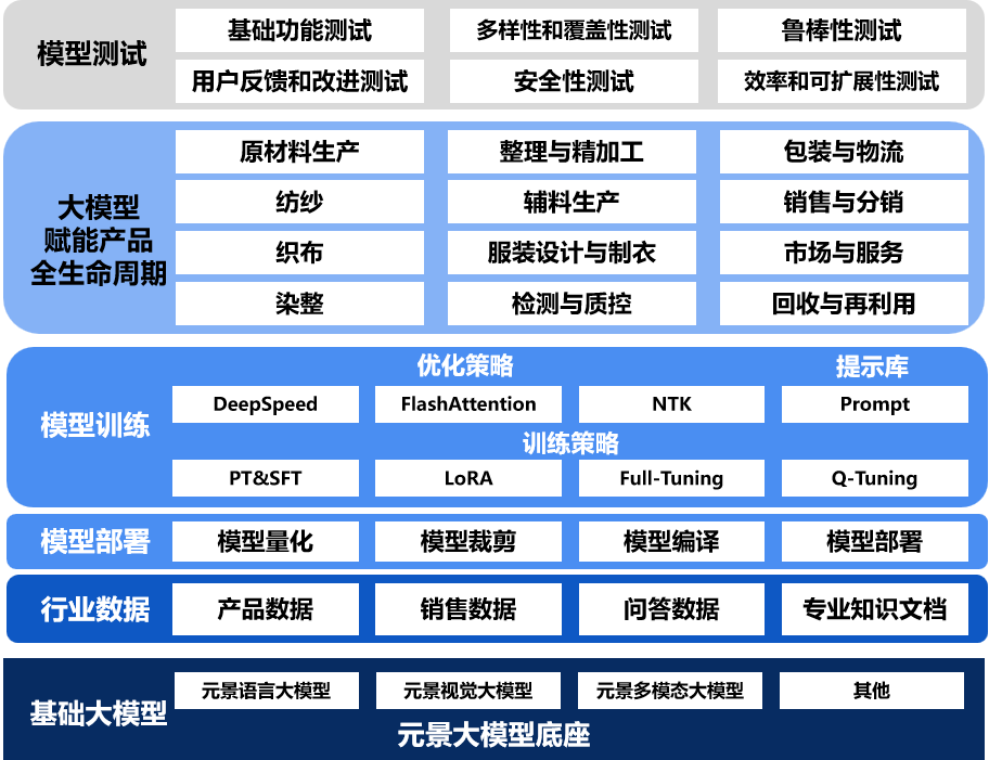 本測試床以聯通元景大模型底座為基礎,利用紡織業特定數據,針對紡織業原材料生產、紡紗、織布、染整、后整理與精加工、輔料生產、服裝設計與制衣、檢測與質控、包裝與物流、銷售與分銷、市場與服務、回收與再利用等步驟,進行紡織品全生命周期的智能化管理。本測試床架構如圖1所示: