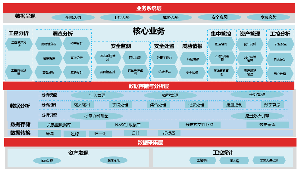 構建企業級態勢分析系統,圍繞企業內部工業網絡數據,構建態勢應用包括態勢感知數據交互式檢索、工控數據實時監測、態勢分析模型、安全風險快速處置、工業安全問題追蹤溯源等功能。